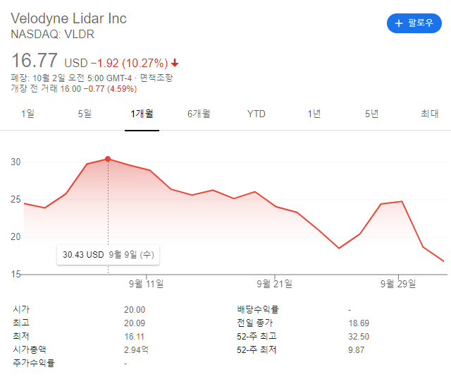 이 회사는 자율주행 관련해서 아시는 분들은 다 들어보신 '라이다' 회사입니다. 회사 이름이 벨로다인이고 합병 전엔 GRAF라는 SPAC으로 거래되었죠. 한 달 전까지만 해도 30불까지 치고올라가던 주식이 거품 쭉 빠지고 다시 합병직전 기대감에 차오르다가 합병 직후부터 그냥 밑도끝도 없이 박살중입니다.