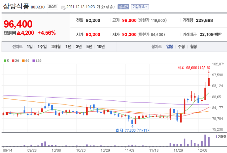 https://new.redtea.kr/?b=39&n=6093 불닭이 아닙니다. 불사조 부활하십니다~ 날아오르라 주작이여~ 환상의 날개~ 11월말에 급오르면서 정찰병도 다 못태우고 갔는데 여하튼 가즈아~ 저는 자이에스앤디를 버리고 그냥 에스앤디를 쪼꼼 태웠습니다.ㅠㅠ 에스앤디가 삼양식품 불닭 소스 재료 만들어서 납품하는 곳이라 실적이 거의 연동된답니다~ 1