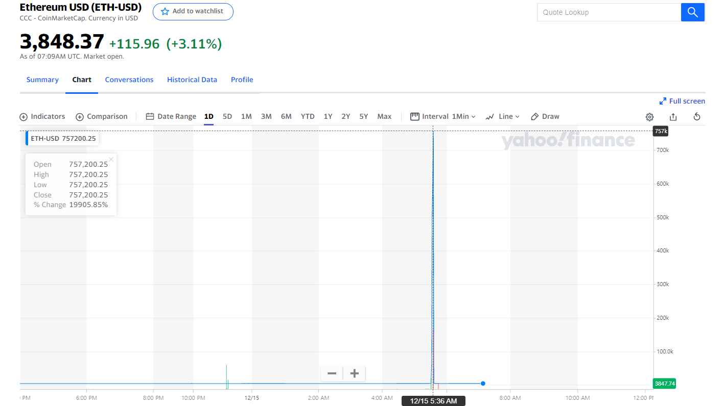 오늘의 야후 파이낸스 이더리움 차트인데 fat finger로 의심되는 거래가 있었나봅니다. 순간적으로 19905% 폭등 ㅡㅡ 0