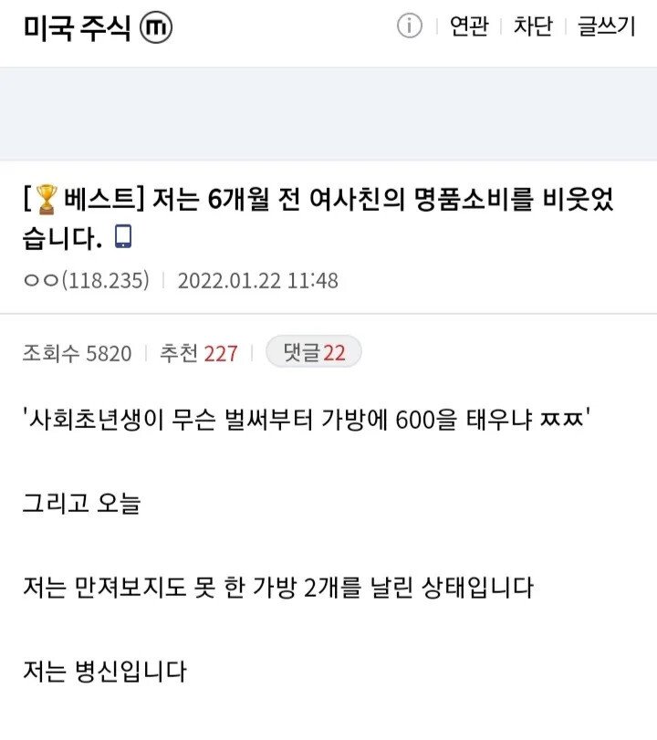 | Subject | 여사친 명품 산다고 무시했던 주식갤러 |