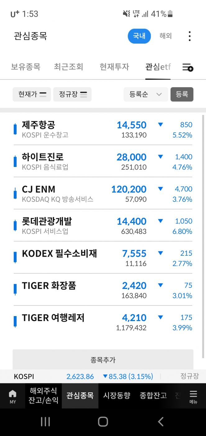 현재 주식10%,금20%채권20%현금50%(3월에 동일량의 현금 적금 입고 예정) 인데 머리속에 "지금이니?" 가 자꾸 왱왱왱.. 포스트코로나 K관광 붐을 노리고 보고 있읍니다. 아직 동트기 직전이 아닌가 현금 쥐고 있기 너무나도 힘드네욥... 0