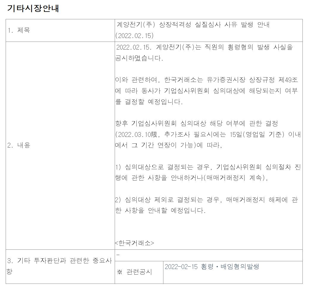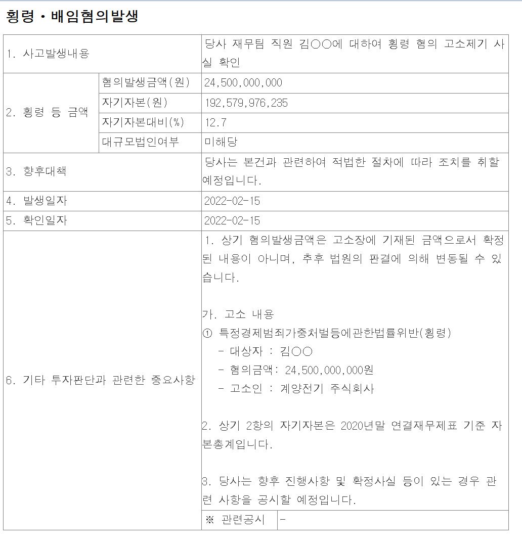 | Subject | 계양전기 횡령/배임혐의 발생 |