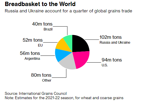 Wheat Soars With Trade From Crucial Black Sea Region Paused https://www.bloomberg.com/news/articles/2022-02-28/wheat-soars-with-trade-from-crucial-black-sea-region-in-limbo 밀과 옥수수 선물은 일일 가격제한폭까지 오르는 모습을 보여주었습니다. 빵을 좀 줄여야 하나?! 1