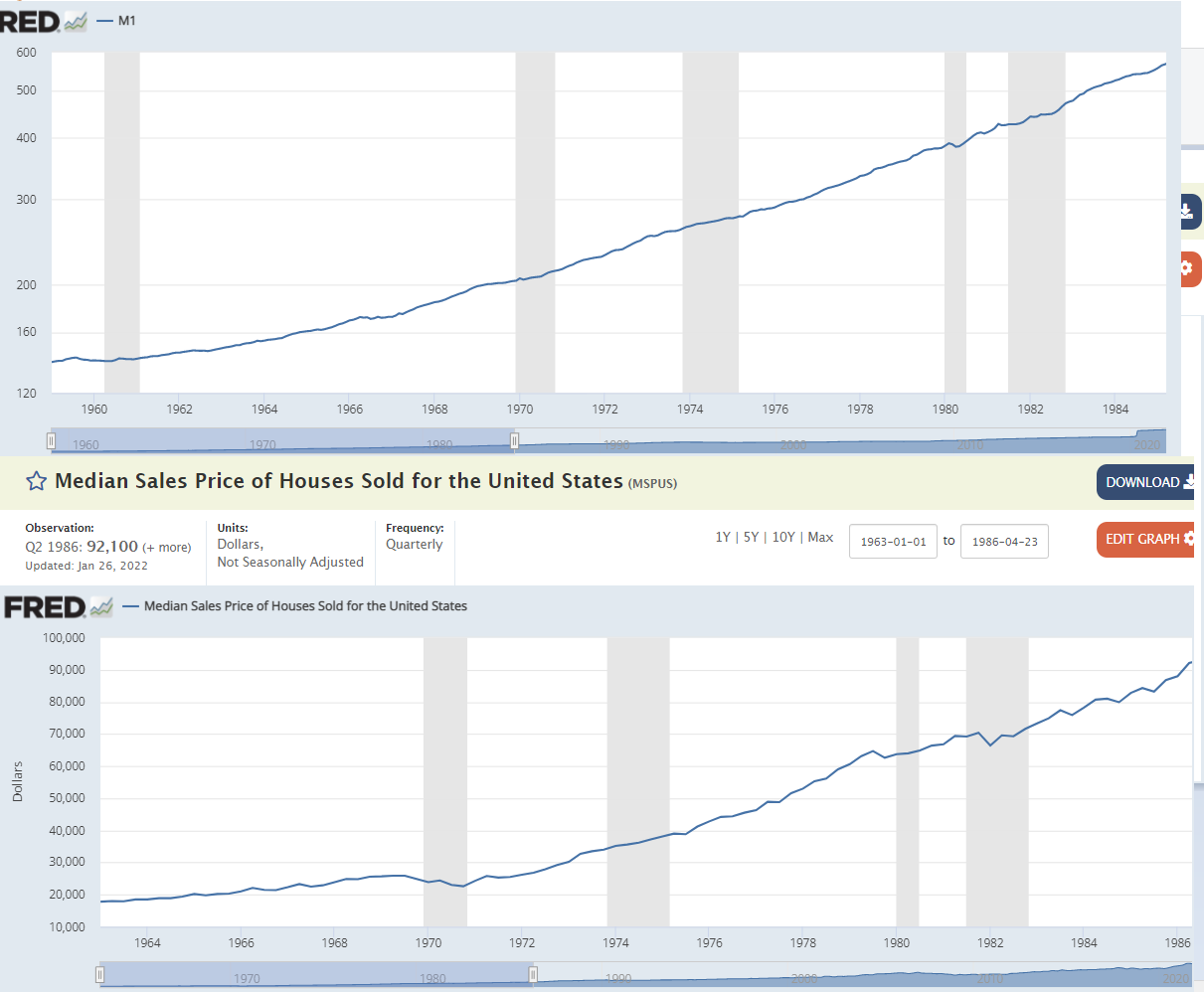 인플레이션의 2가지 - 수요견인, 비용인상 지금은 명백한 비용인상 -> 물가상승 물가상승으로 소비, 고용이 줄어들고 경기가 하강할지는 미지수 여기서 임금상승으로 인한 수요증가+경기성장의 경우 주식은 좋을테니 일단 패스 더 생각할 필요는 없음. 다만 비용인상+침체의 경우. 즉 스태그플레이션이 될 경우? 비용인상-소비침체-고용감소-소비여력감소-고용감소-소비침체->악순환 이걸 해결하기 위해 70년대에는 폴볼커가 금리인상으로 때려잡음. 근데 첨부된 사진에서 보면 70년대를 거치며 금리 높여도 본원통화 M1은 계속 증가함. 금리 올리는데 집값도 계속 증가함. 생각해보면 전 세상에 100의 돈이 있다고 할 때 정부가 돈을 더 찍지 않아도 금리가 20%면 내년에 돈의 총량은 120이 될 수 밖에 없음.. 결국 통화량 자체가 늘어나는 건 스태그플레이션이 와도 변하지 않음?? 스태그플레이션의 경우 금 Good, 부동산 Good 주식은 X. 여기서 스태그로 빠지지 않고 경기가 좋아지는 경우 부동산 Good 주식 Good 금은 X 결국 부동산?? 0