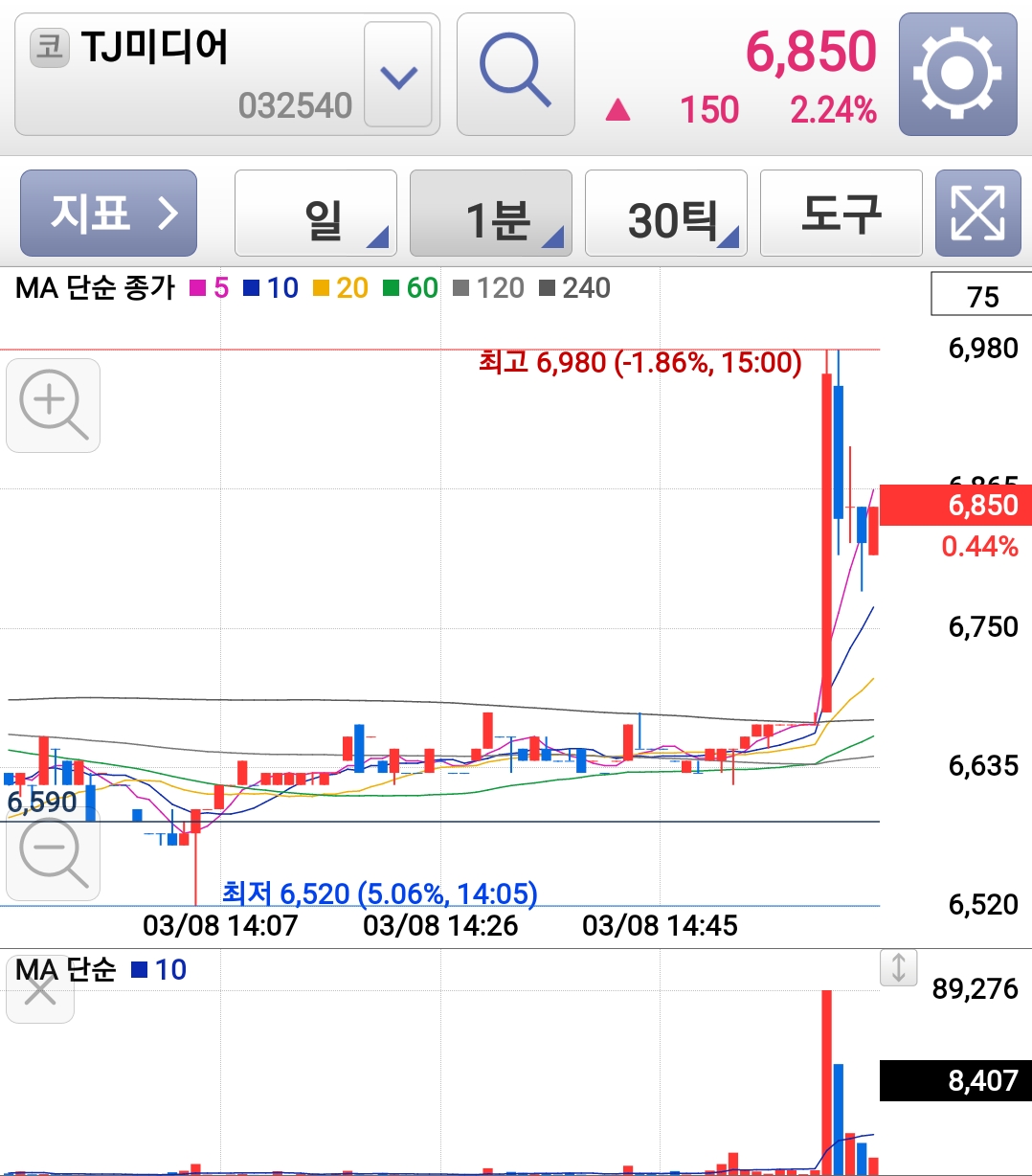 차트 보고 계좌 비밀번호 넣고 매수버튼 누르는 순간 갑자기 3%가 떠서 어어 하면서 현재가 현재가 다다다 눌러서 3%높게 샀읍니다 구라 안 치고 5초만 빨리 샀어도 3% 이득이었는데요 1
