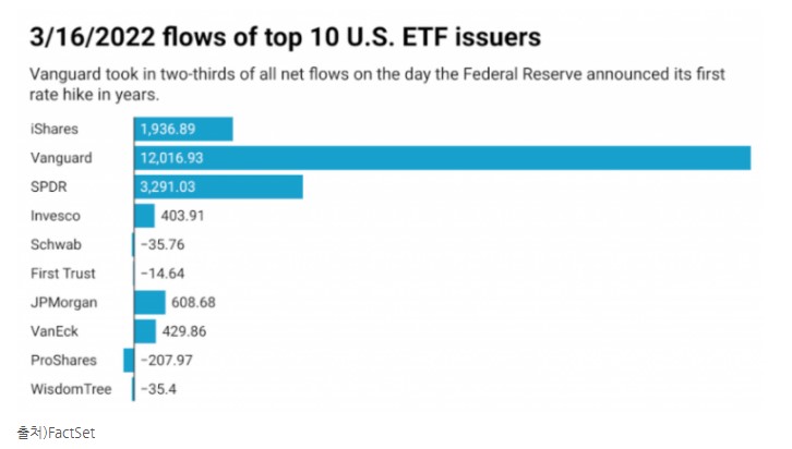 3/16 연준이 금리 인상을 발표한 날 미국 전체 펀드 net-inflow의 2/3이 뱅가드 펀드로 갔다고 합니다. 보글센세... 0