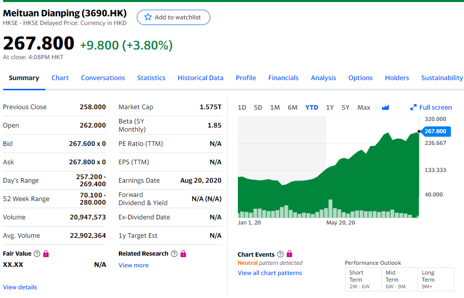 중국(또는 홍콩) 장은 거의 모르지만, 그래도 몇몇은 나름 확실하게 알고 있다고 생각합니다. 사실 중국도 가만보면 괜찮은 회사들이 꽤 있어요. 다만 100주 단위라 접근이 쉽지 않고, 한국이 옛날 대북리스크 지듯(지금도 좀 있지요) 미중분쟁 리스크에 자주 출렁거린다는 단점, 그리고 정보의 딜레이가 좀 있다는 문제도 있읍니다. 메이투안디엔핑은 그 중 하나입니다. 이미 여러 차례 언급했고, 한국에도 잘 알려진 회사라 자세한 설명은 생략합니다. 주가가 다시 전고점 돌파하러 달려가는군요. 4