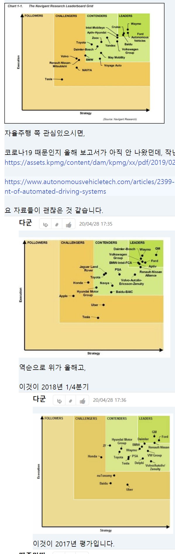 저는 테슬라의 배터리 관련 이야기나 양산관련 능력은 별로 신뢰하지 않습니다. 특히나 배터리는 10년 전 뻥친 것조차 지금 못 지키고 있죠. 그런 것들보다도 테슬라에서 가장 높게 치는 것은 바로 넘4벽의 주행 데이터와 구독경제로 가는 시스템입니다. FSD를 정말 높게 치는 현직자들이 많더군요.
