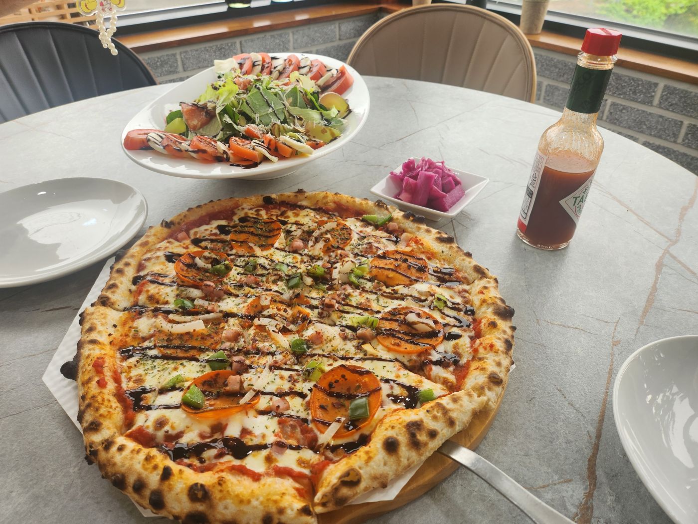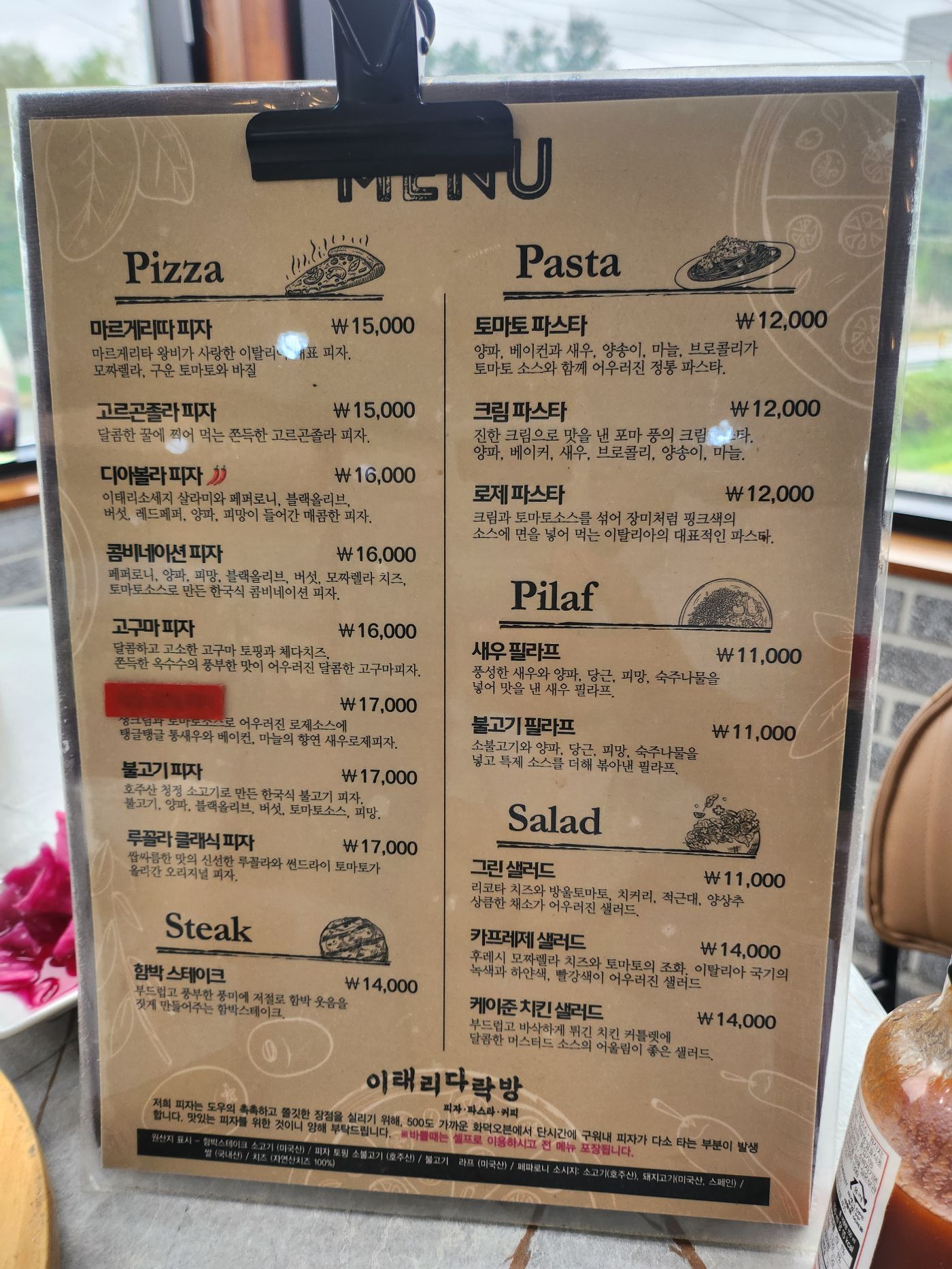 이태리 다락방 이라는 화덕피자 맛집입니다. 알게된 경유는 누수 된다고 출장 와달라해서 갔는데 누수는 아니라 점검만 해주고 오려는데 레스토랑이여서 매뉴좀 보고 사장님하고 이야기 하고 가격보고 속으로 괜찮네 하고 생각하고 있다가 '오늘 와이프랑 데이트할겸 올라와봤습니다'. 상당히 만족했고 30분 온게 후회 안되는 좋은 맛이었습니다. 메뉴판 보셨겠지만 가격이 정말 괜찮습니다. 그에 비해 음식이 별로냐? 그것도 아닙니다. 화덕피자는 도우를 직접 만들어서 숙성시키는 수제 피잔데 도우도 너무 쫄깃쫄깃 맛있고 치즈와 토핑도 맛있고 신선하기 그지 없습니다. 카프레제 샐러드도 들어간 야채들이 신선하고 모짜렐라 치즈와 토마토도 맛있었습니다. 사진에 없는 로제파스타도 먹었는데 이 것도 괜찮았습니다. 양이 조금 작긴 하지만 1.2만원에 이정도 퀄이라면 그냥 샐러드 하나 더 시키지 뭐 하고 먹을 거 같습니다. 음료도 아메3천 라떼4천 맥주 330ml 3천 골든메달, 번다버그 음료등 4천원으로 정말 레스토랑답지 않은 가격입니다. 아메리카노는 식후에 한 잔 시켜서 마셨는데 맛도 괜찮았습니다. (커피에 무던하지만 신경쓸 때는 엄청 예민함) 수도권이 아닌 변방에서 이렇게 괜찮은 음식을 괜찮은 가격에 먹을 수 있어서 너무 좋았습니다. 반드시 올 필요는 없지만 영덕쪽 갈 때 잠깐 속리산IC로 국도로 나와서 지나가며 드시고 화서IC에서 고속도로로 다시 올라가면서 들려볼만 합니다. https://share.google/bKfImkrselGubd856 주소입니당. 2
